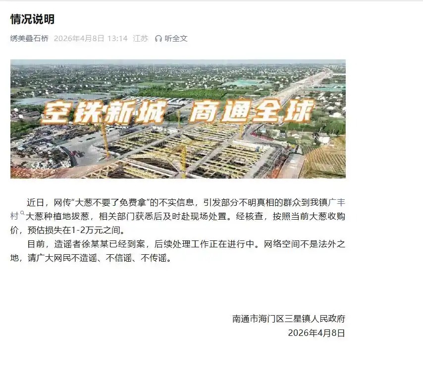 江苏南通市海门区三星镇东谈主民政府4月8日发布情况讲明: